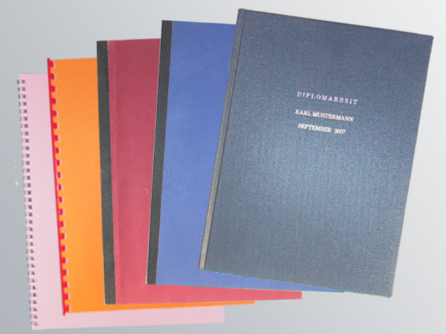 Ob Broschüre, Vereinsschrift, Programmheft, Lehrgangsunterlagen oder Ihre Diplomarbeit... Bei uns finden Sie bestimmt Ihre passende Bindeart. Wir fertigen von der einfachen Ringbindung mit Kunststoffspiralen über Klebebindung, Blockbindung und Rückenstichheftung bis zur professionellen Buchbindung mit Deckel- und Rückenprägung.
